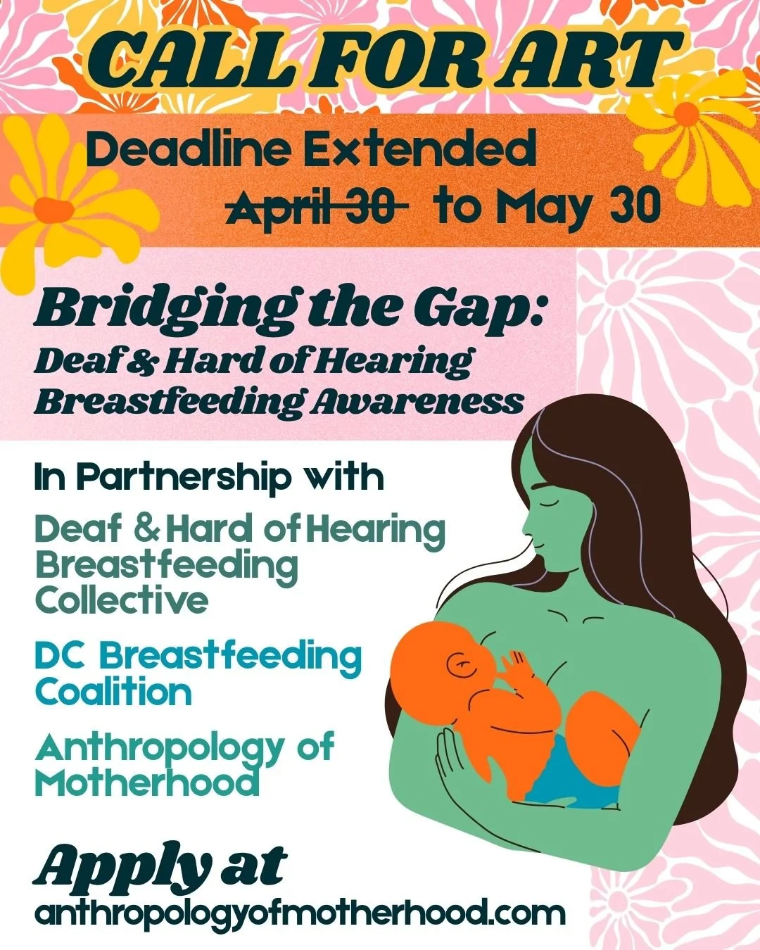 Selected works will be featured in a group exhibition at the Washburn Arts Center at Gallaudet University in Washington, DC, from July through August of 2026. Then, the selected works will be featured in a virtual group exhibition on the Anthropology of Motherhood website and social media platforms during Deaf & Hard of Hearing Breastfeeding Awareness Week, September 16-22, 2026.