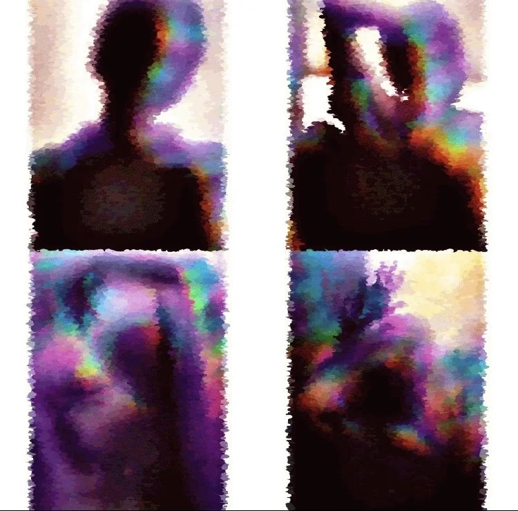 “Noise,” was made after progressive hearing and vision loss (experienced following repeat Covid infections which caused tinnitus, visual snow syndrome, and auditory hallucinations that eventually required me needing hearing aids) altered how they perceived both myself and the world around me as an already-disabled person. I can no longer hear “silence” or see without static- like distortion, which is why the piece is called “noise.” In its original form, this noisiness was represented as an animated portrait that was projected onto a wall. Viewers can see this in the form of a GIF by scanning a QR code bow.